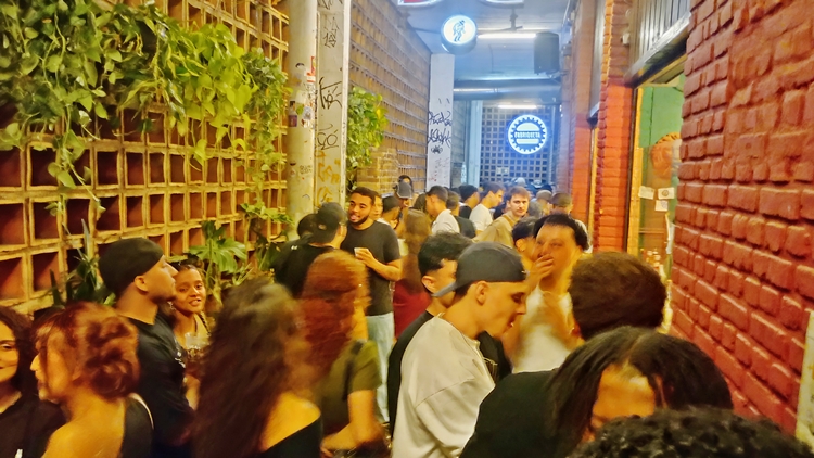 celebração urbana, com bares lotados, música ao