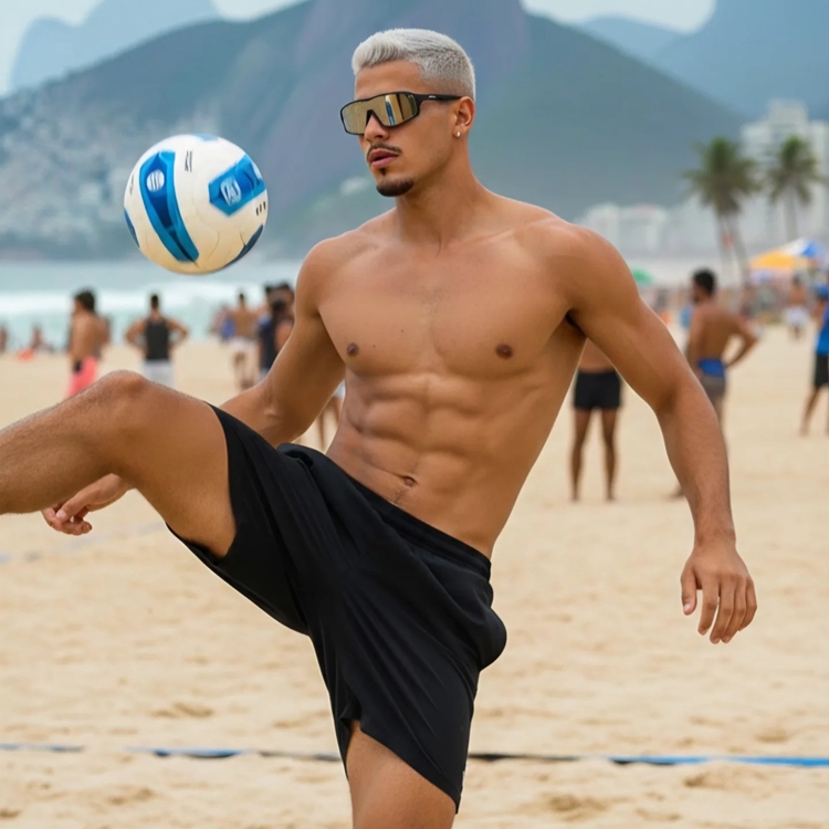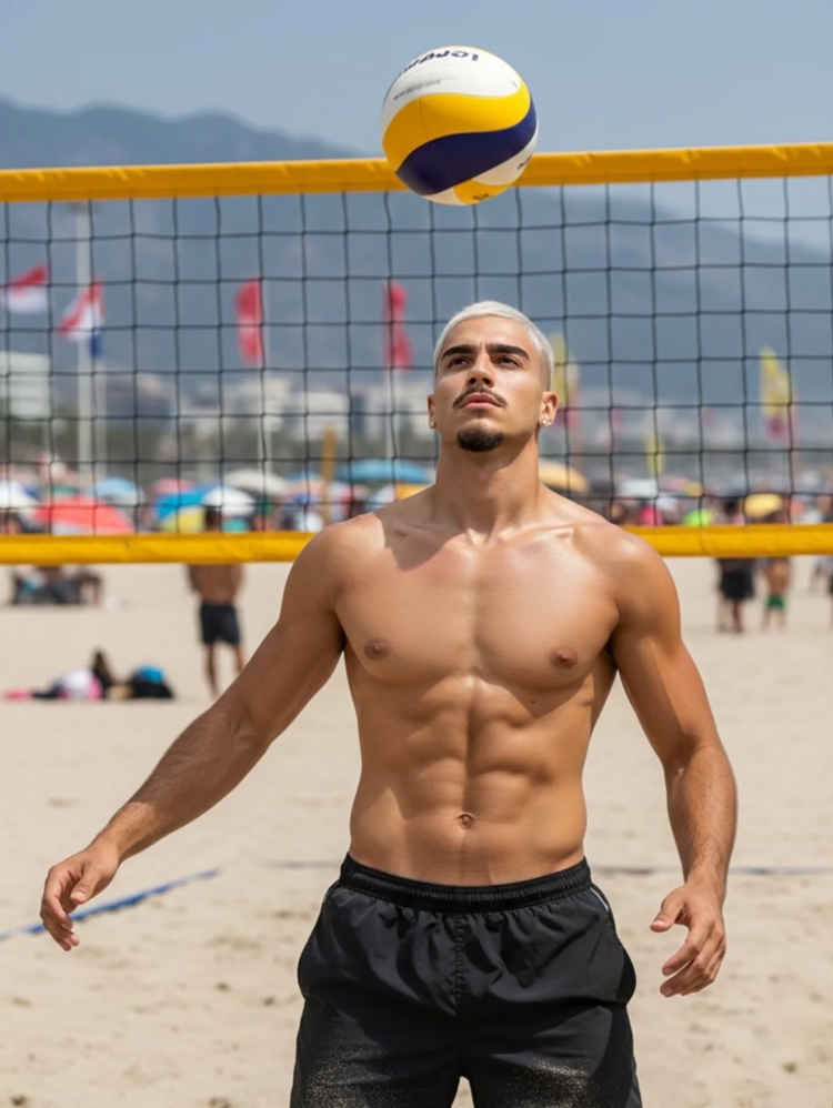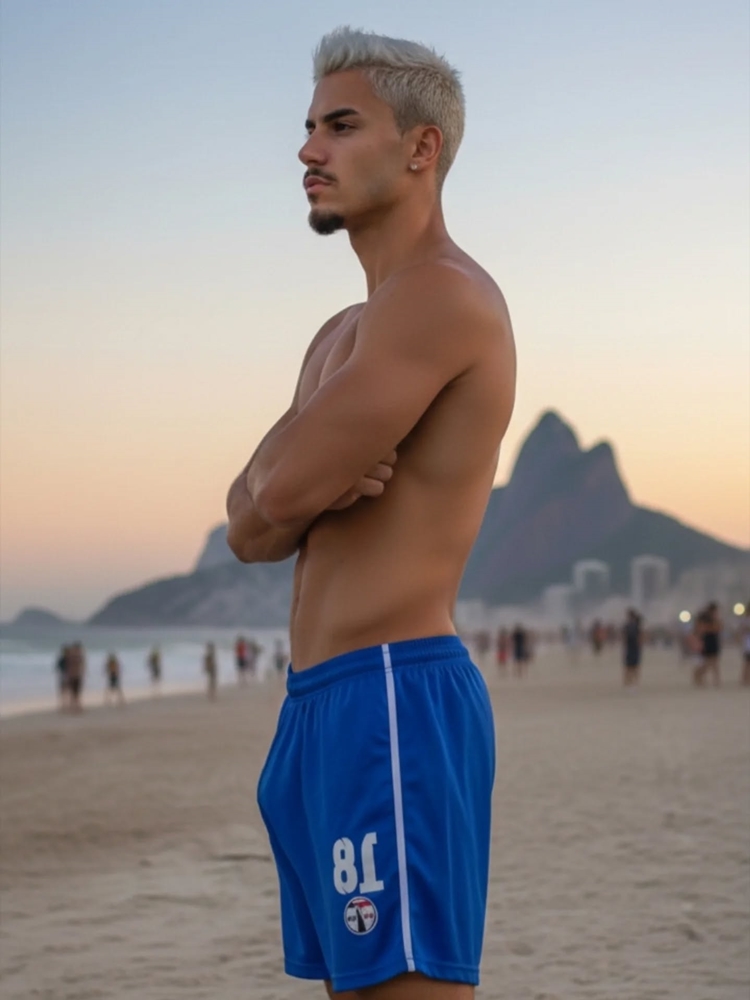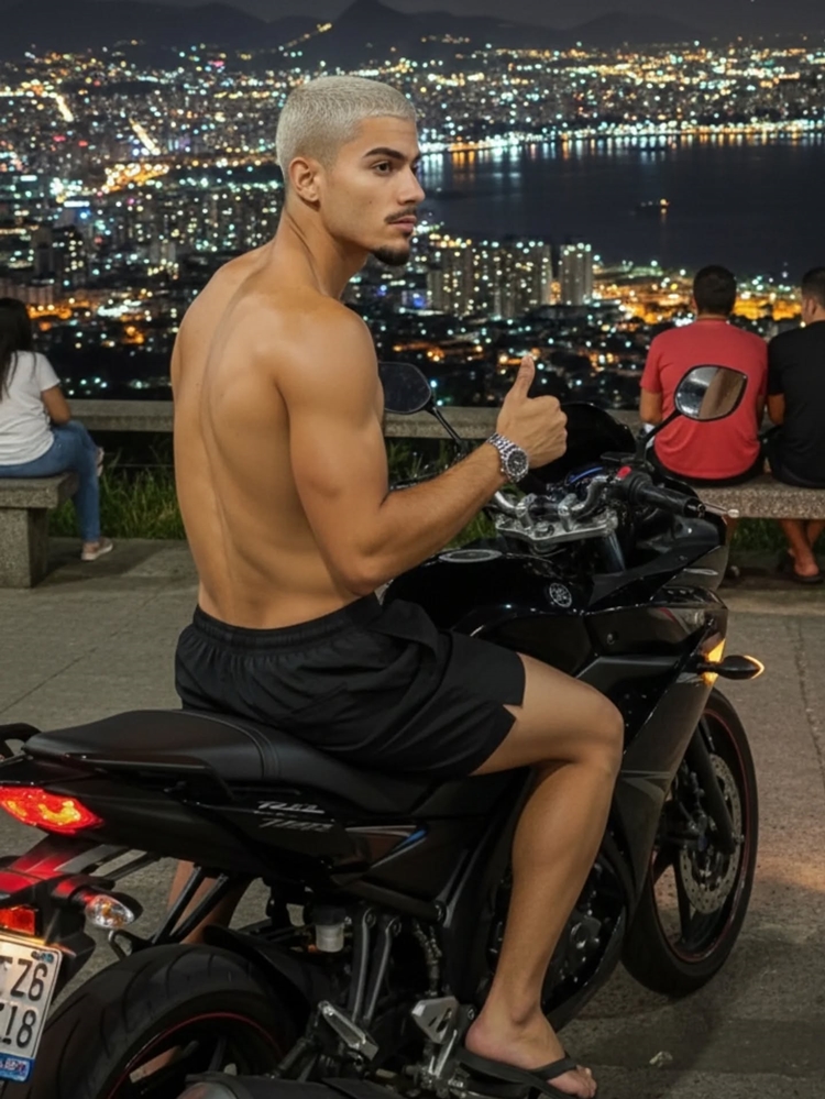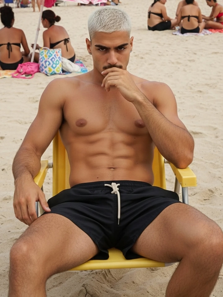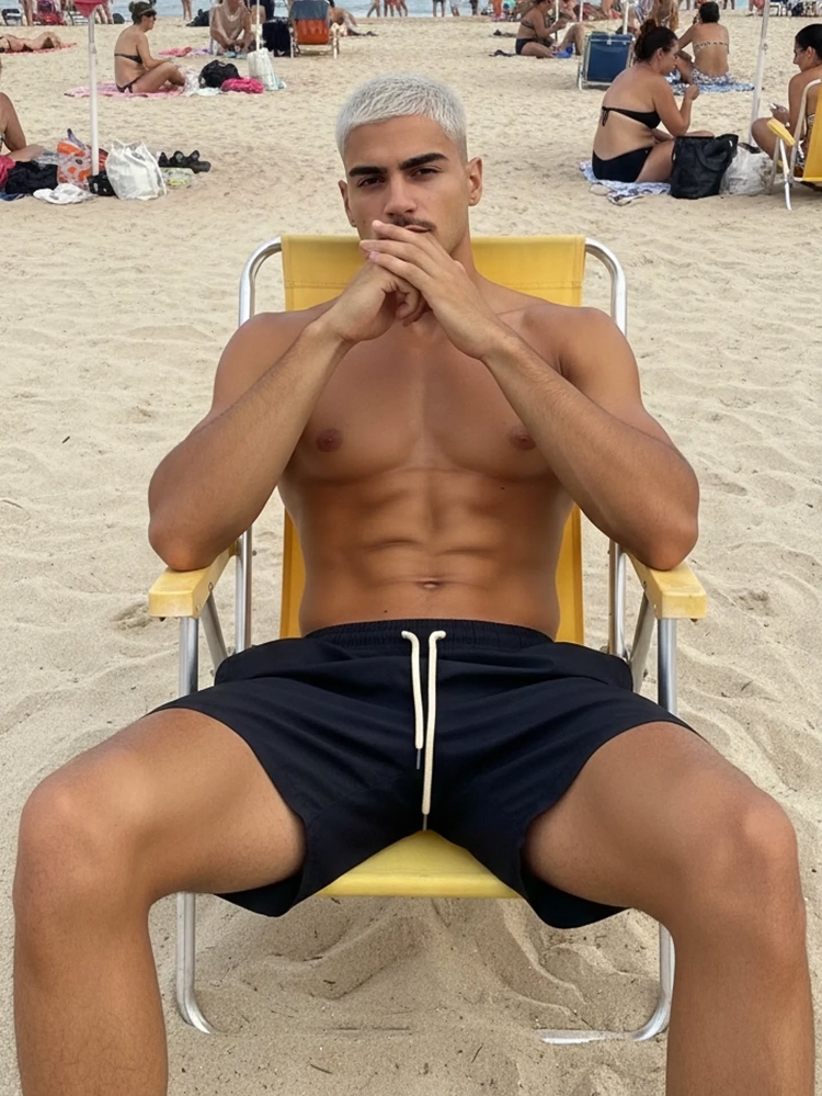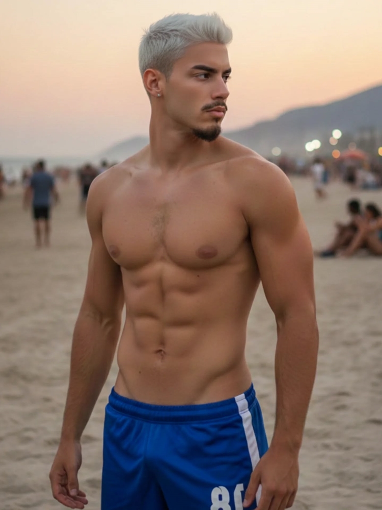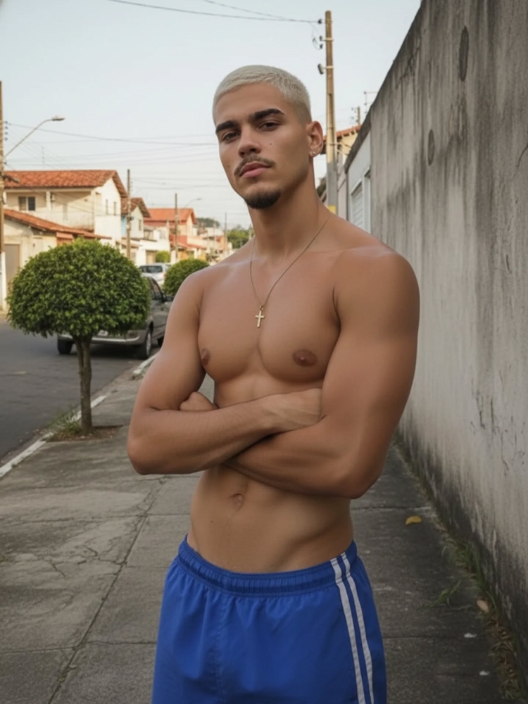 sem camisa, ressaltando sua boa forma e