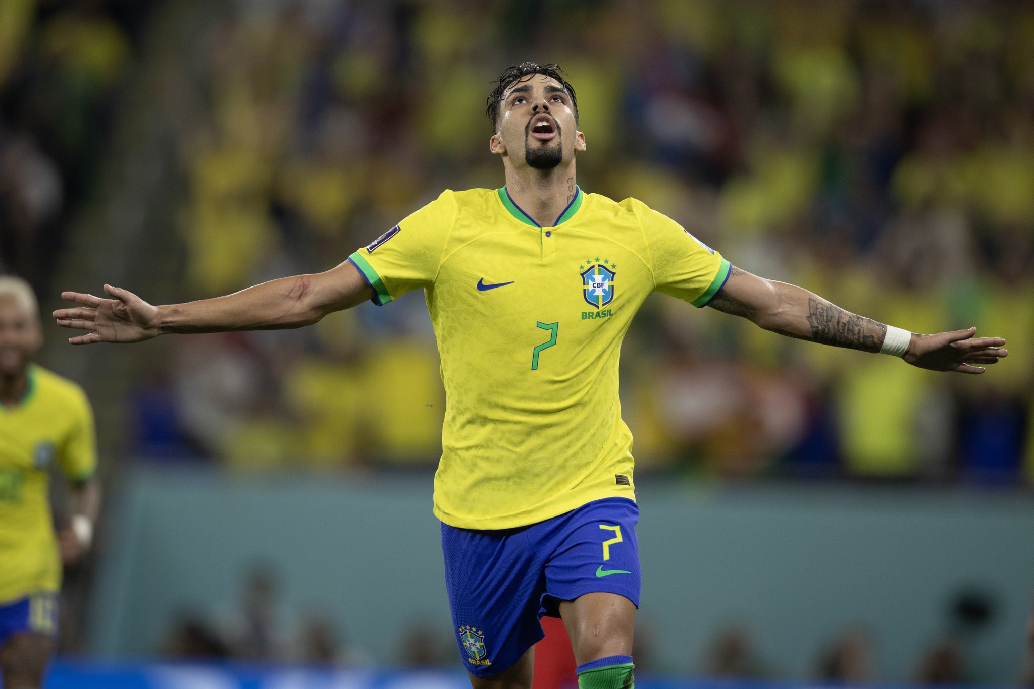 leva para o fundo e cruza pelo alto. Lucas Paquetá vem de trás sem