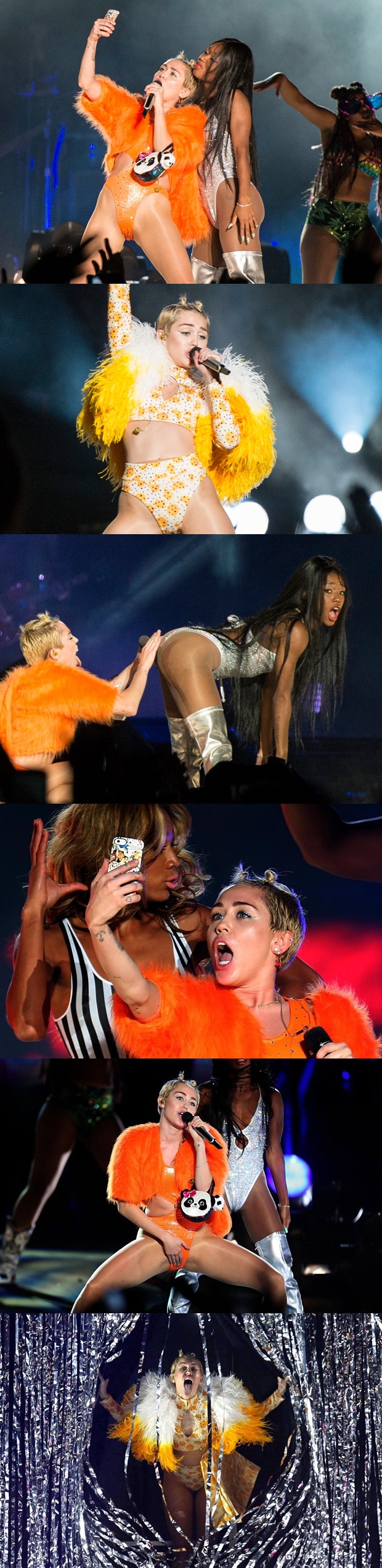 A apresentação de Miley mais lembra uma festa de aniversário infantil rebelde, repleta de traquinagens cafonas com bichos de pelúcia gigantes e dançarinas desajeitadas, do que um espetáculo musical. "Eu quero ouvi-los mais alto", disse Miley antes de emendar a canção Maybe You're