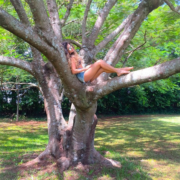 shortinho em cima de uma árvore. Ela publicou a imagem em seu