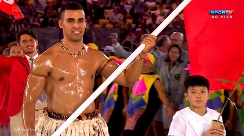sexta, (05.08), no Rio de Janeiro. Pita Taukatofua, lutador Taekwondo, conseguiu chamar a atenção bezuntado em óleo.
