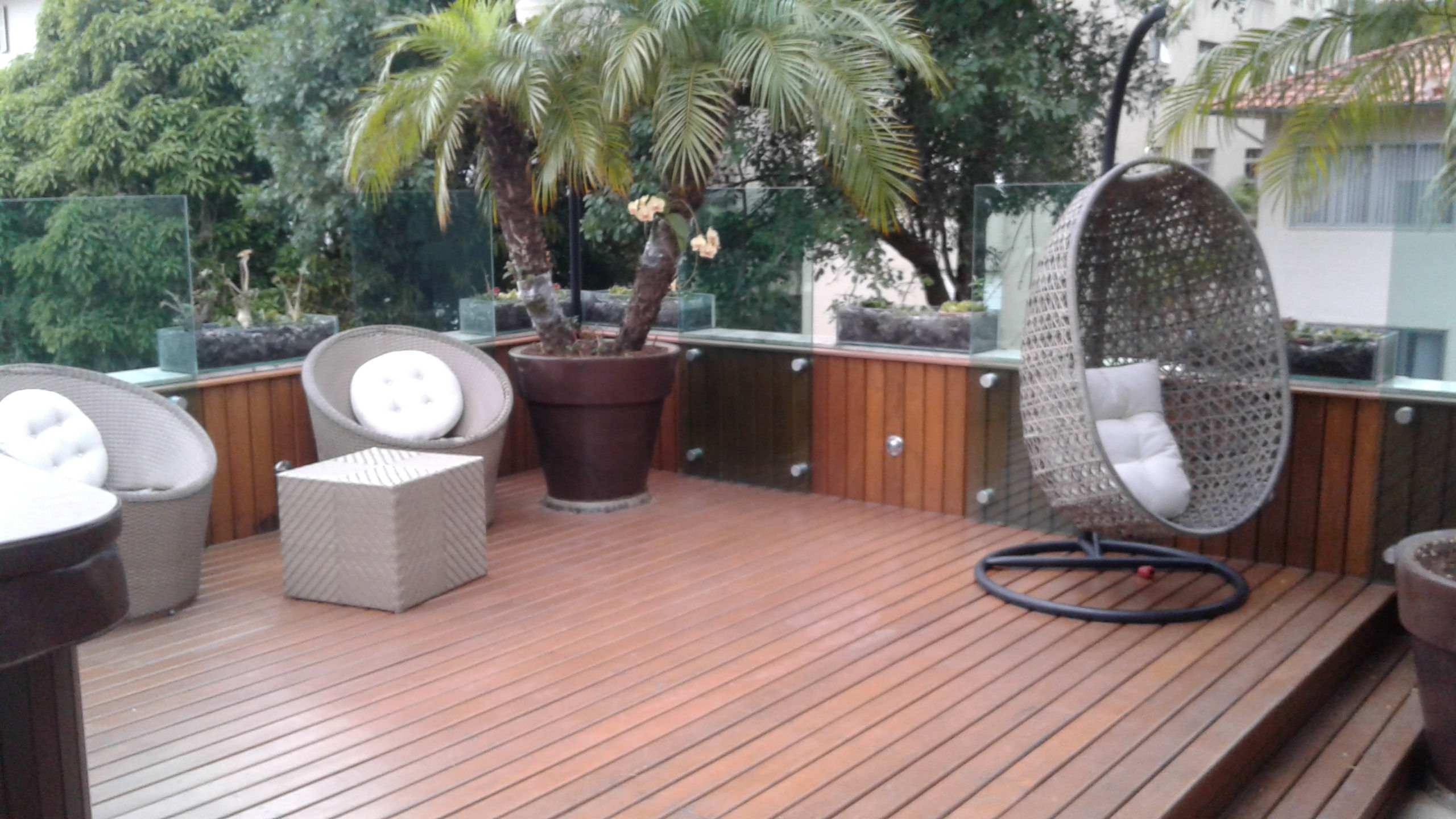 Vasos com palmeiras e um grande deck além de