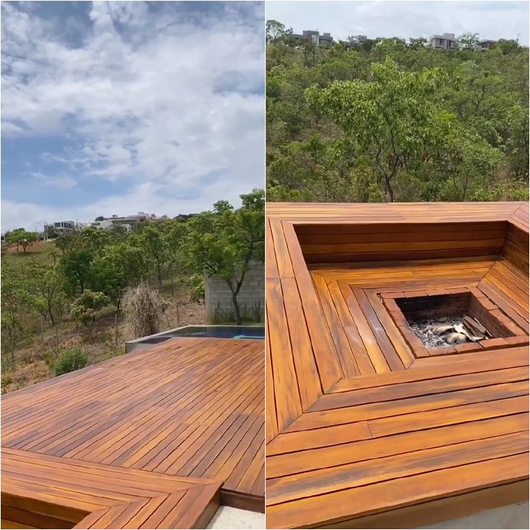 jardins enormes e um deck gigante com uma lareira e uma