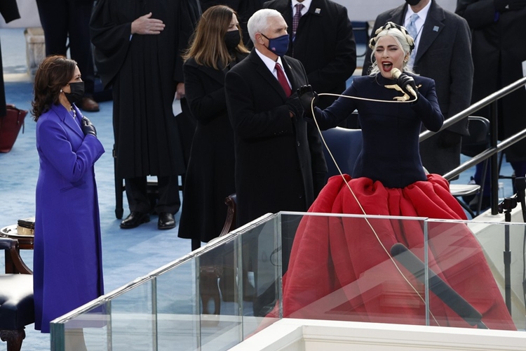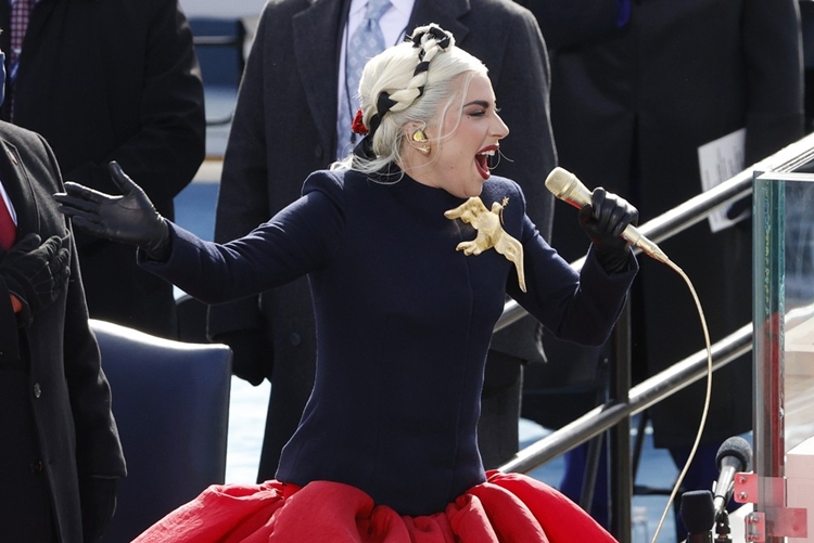 acompanhada pela banda dos fuzileiros navais. Gaga