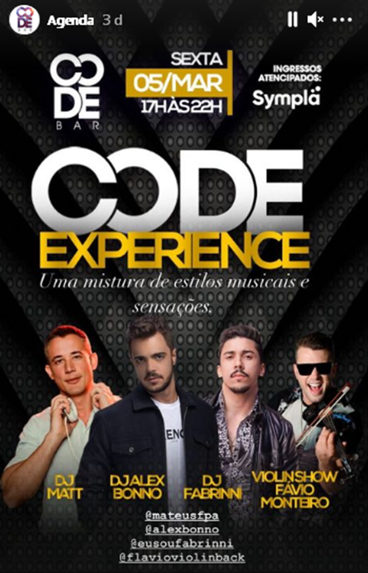 O Code Bar em BH preparou uma noite especial com os DJs Alex Bonno, Matt e Fabrinni e o violista Fávio Monteiro na sexta, (5/3), em BH. O projeto do artista é misturar a música clássica do violino com música eletrônica.