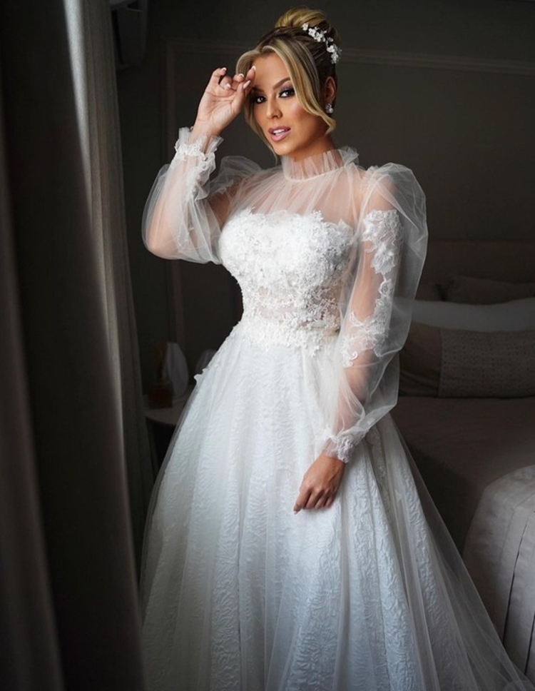 que usou um vestido com renda e manga longa,