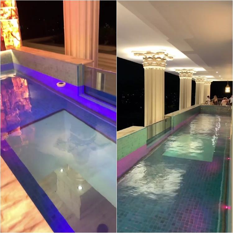 entrada da mansão, piscinas com fundo de vidro,