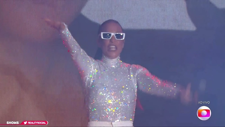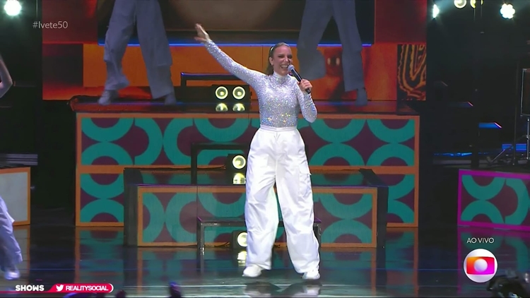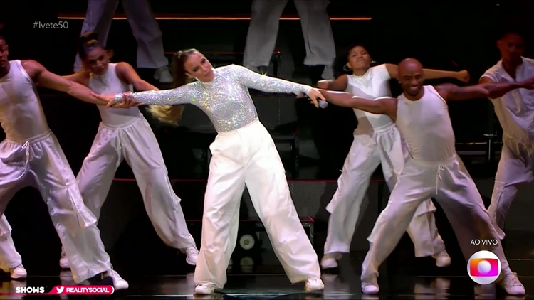 calça branca e blusa brilhante Ivete já chegou colocando